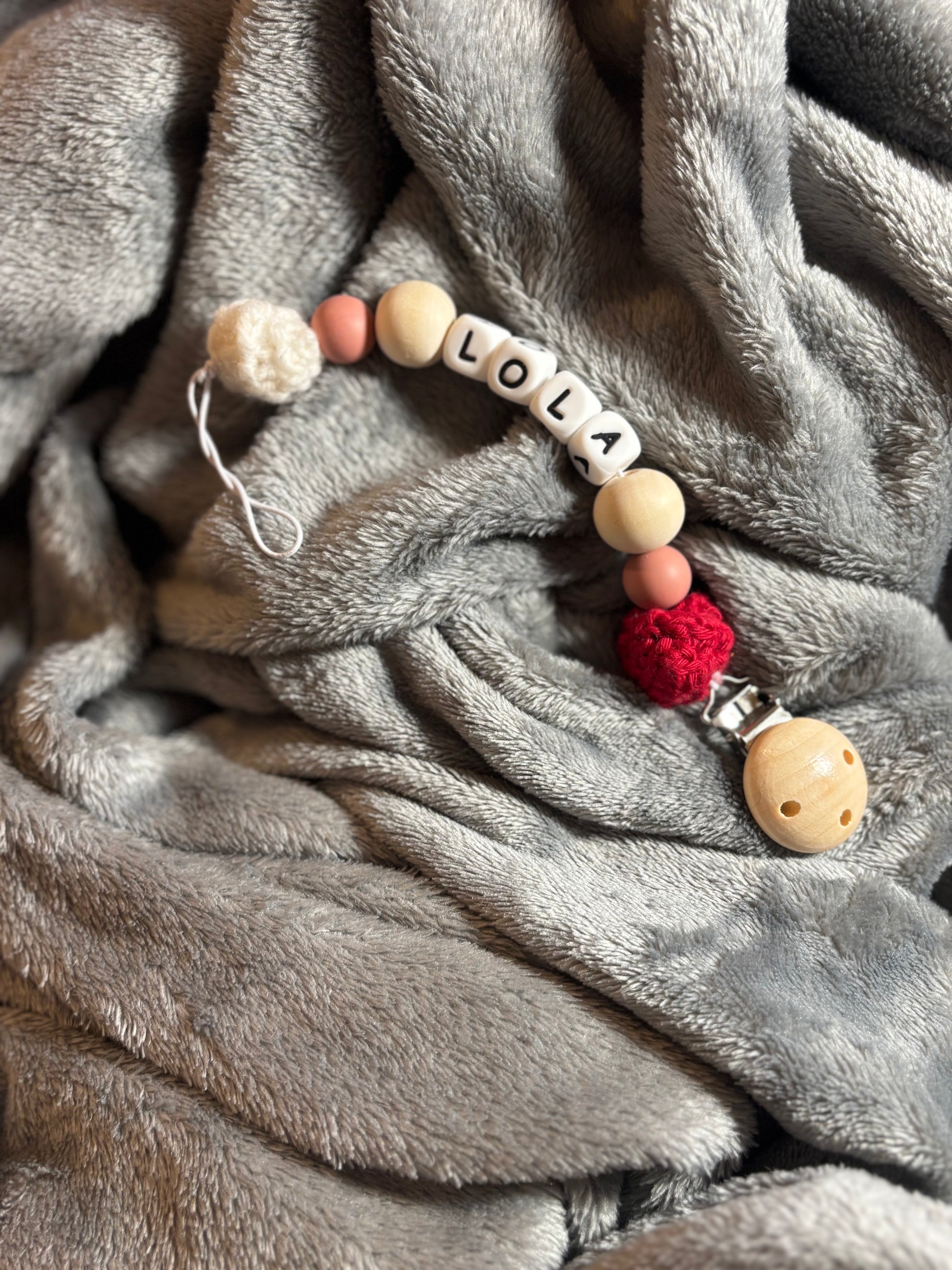 Une attache tétine douce et personnalisée, créée à la main dans mon atelier pour accompagner les premiers instants de bébé. Chaque perle est choisie avec soin pour un rendu tendre et naturel.