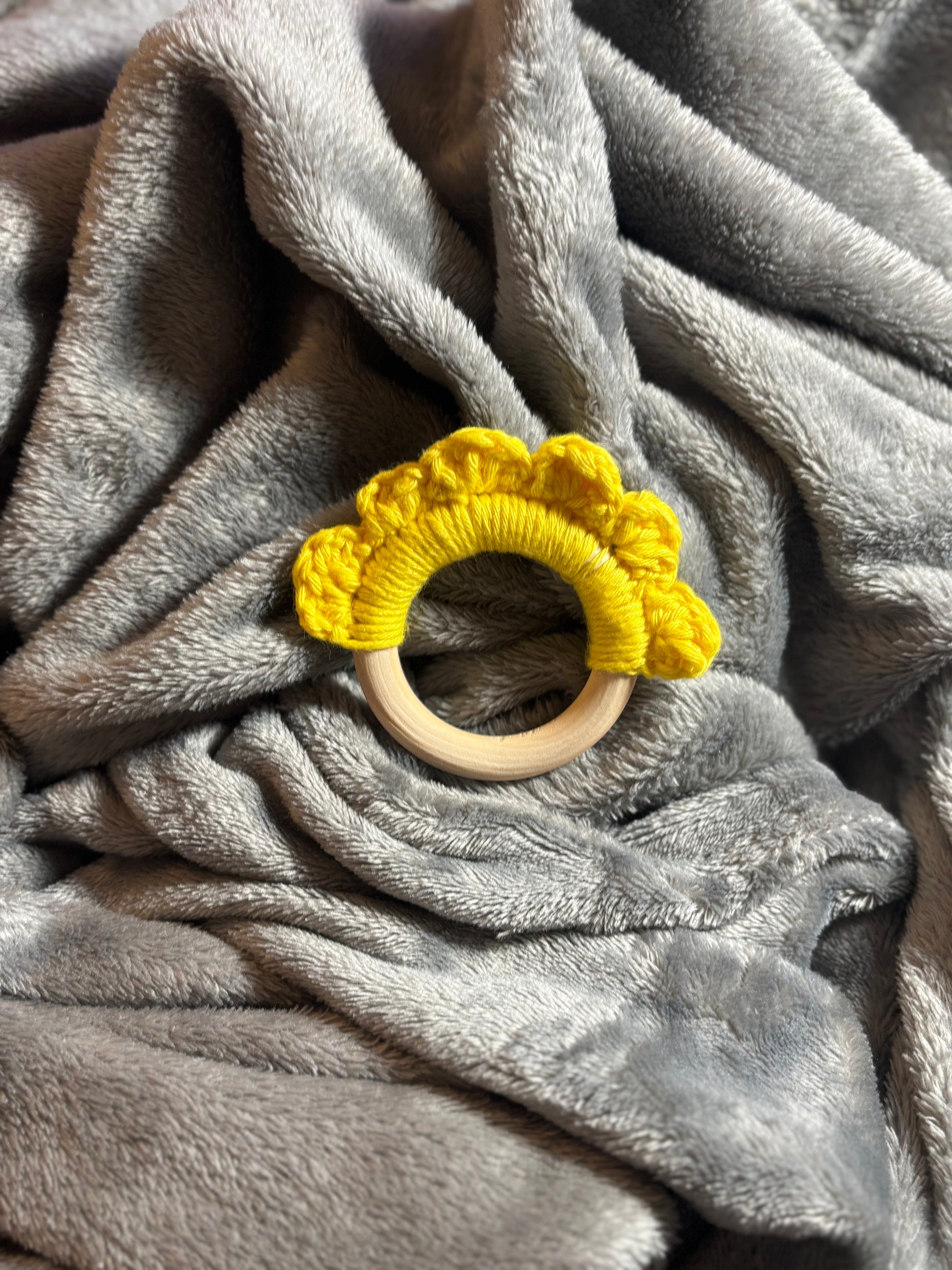 Un hochet tout doux, léger et rassurant pour les premières découvertes de bébé. Composé d'un anneau en bois naturel et d'une touche de crochet, il est parfaitement adapté aux petites mains.